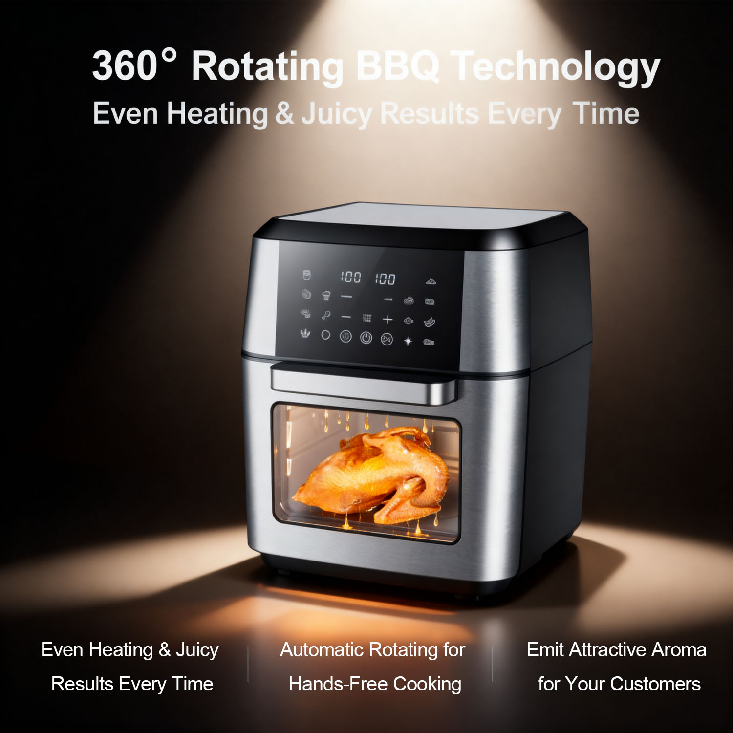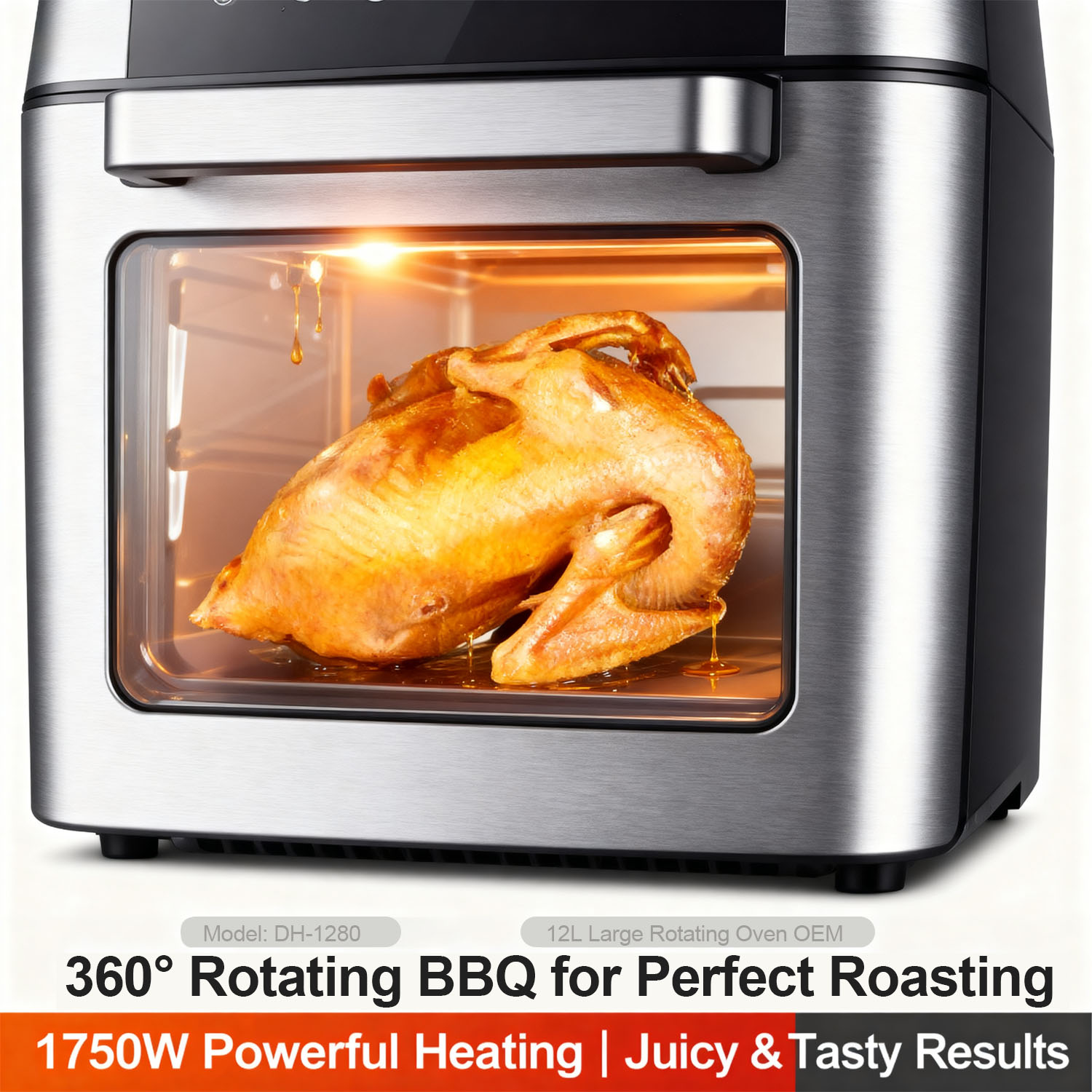 12L Large Capacity with 360° Hot Air Circulation This 12L air fryer oven features a spacious oven cavity with three-layer baking positions. The 360° hot air circulation technology uses a powerful fan to distribute heat evenly, ensuring perfectly crispy results on all sides. Ideal for family meals, entertaining, or batch cooking.01
